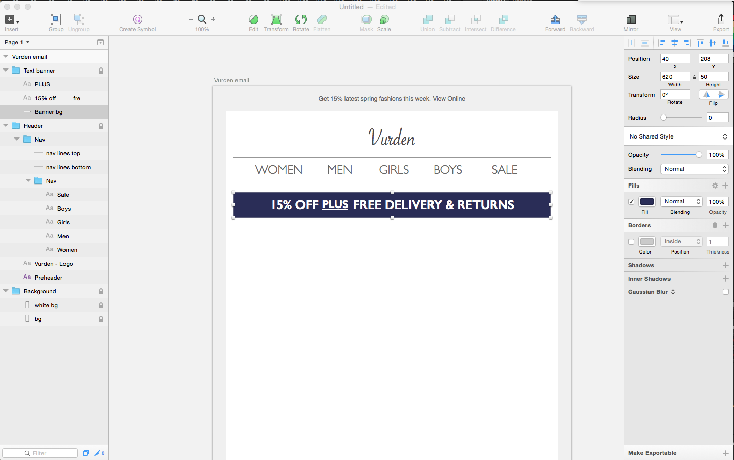 Probably the best way to showcase Sketch for email design is to use it. I have based this design on this excellent Boden email. I thought it had a great design and some concepts and design patterns very common in fashion emails at the moment.